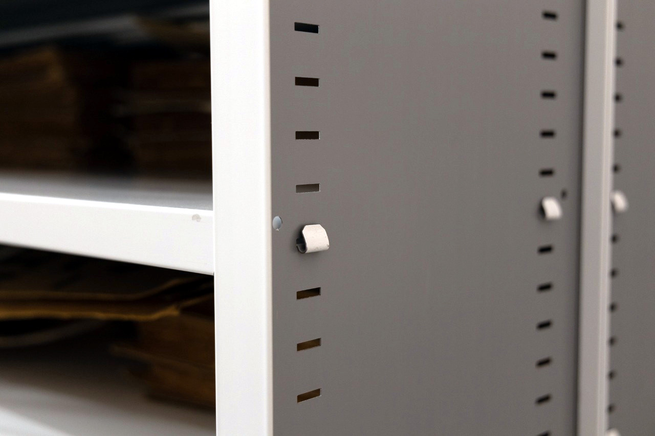 Каркасная часть стеллажей состоит из сплошных перфорированных стоек и переставных полок. Полки крепятся с помощью быстросъемных клипов, что позволяет легко изменять их положение. Расстояние между полками можно регулировать с шагом 25 мм или 12,5 мм, причем шаг 12,5 мм используется в стеллажах с глубиной полки 300 мм.