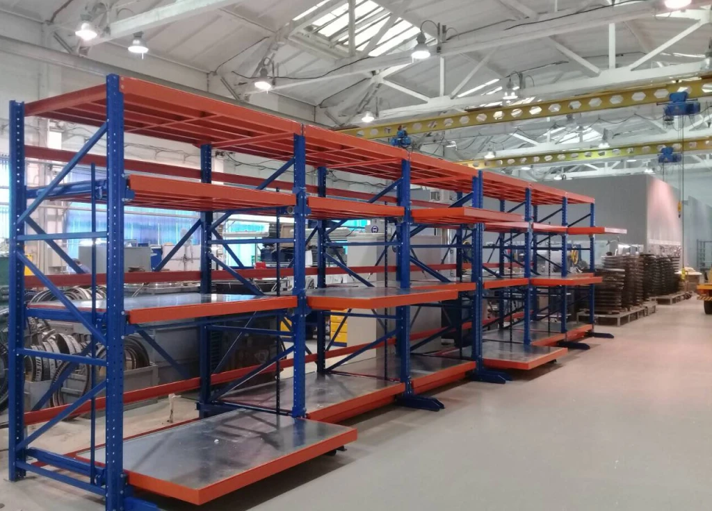 Стеллажи с уровнями частичного выдвижения с нагрузкой до 1000 кг на полку с механизмом защиты от одновременного выдвижения. Подходят для различных заводстких нужд и помещений.